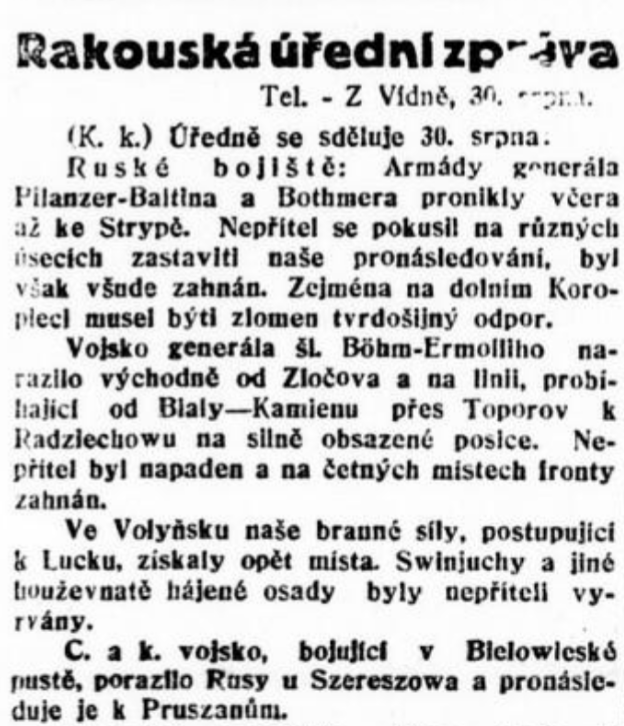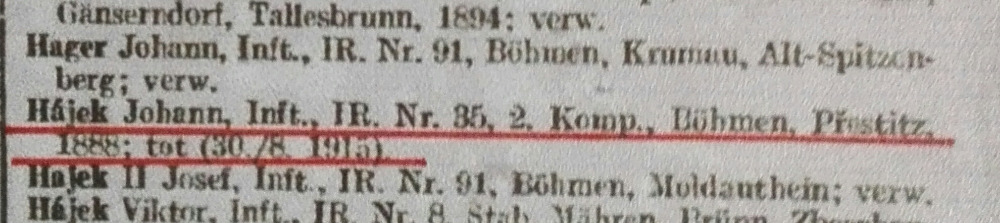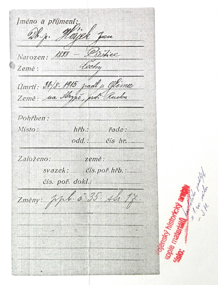 Je na ruském bojišti. 28. 5. 1915 byl lehce raně do nohy a nyní je zas na frontě. 30. 8. 1915 padl v boji u Břežan na ZlatéLípě. Je pochovaný u Glivny tamtéž.